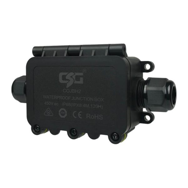 The Connected Switchgear IP68 weatherproof junction box is designed for maximum protection and reliability in harsh environments. Rated at 450V AC and 40A, this durable enclosure features two secure cable entries and heavy-duty glands to ensure a watertight seal. Its IP68 rating offers complete protection against dust and prolonged water immersion, making it ideal for outdoor and underground electrical connections.